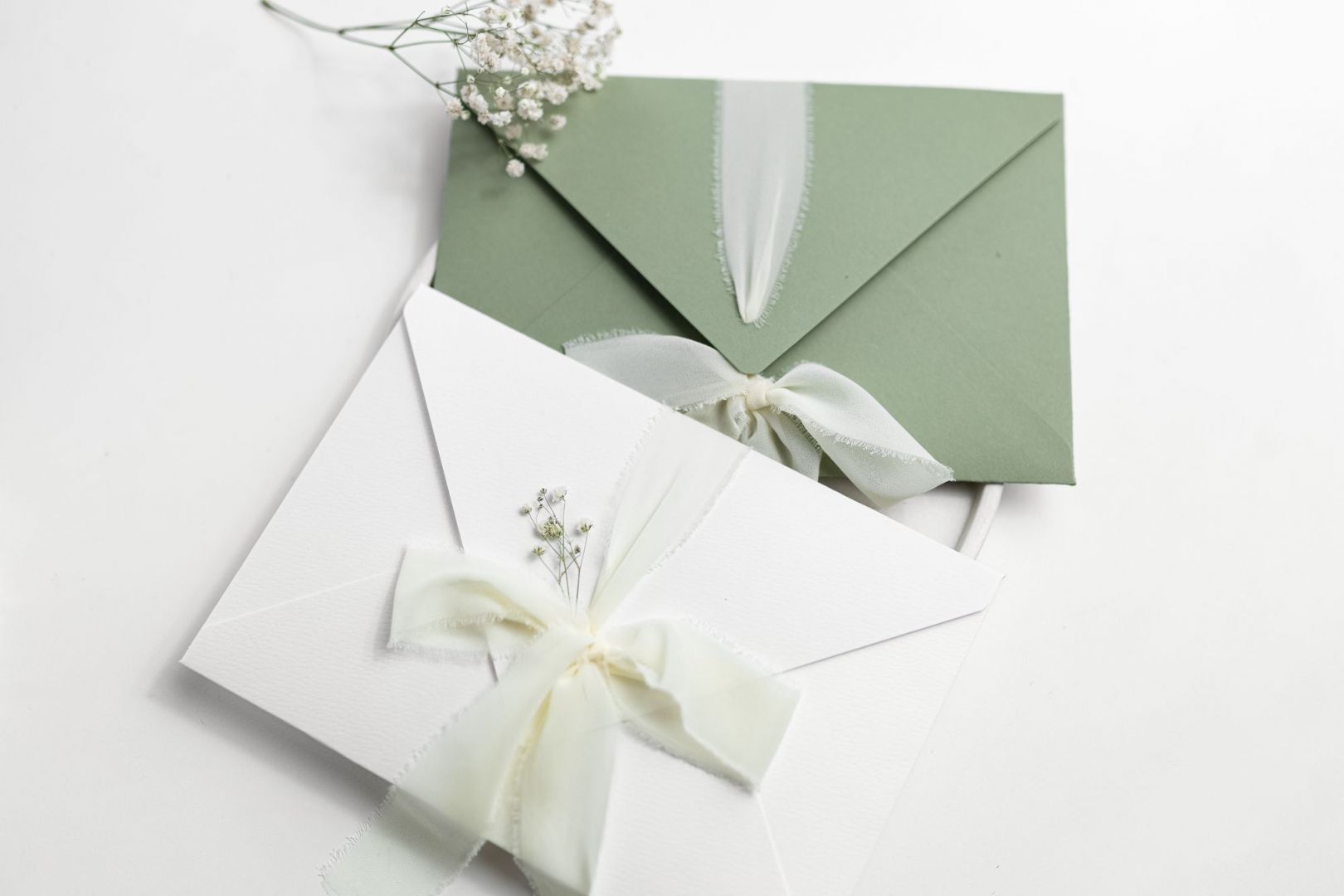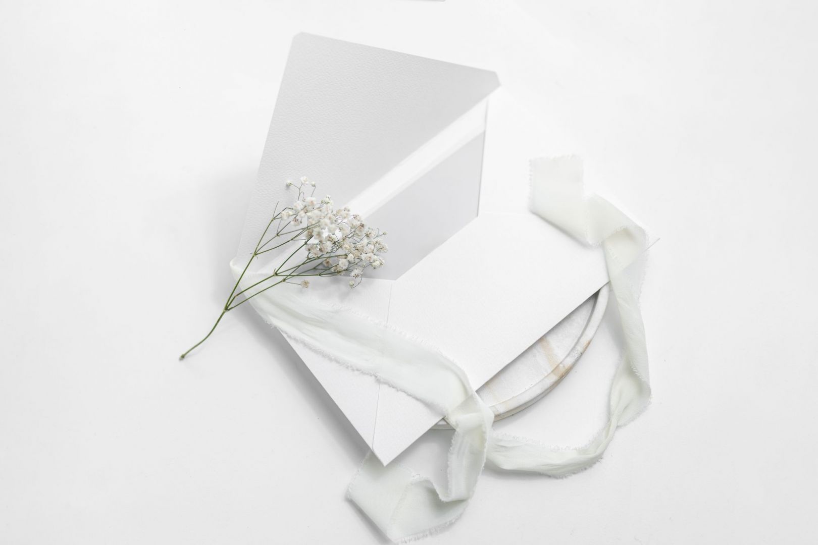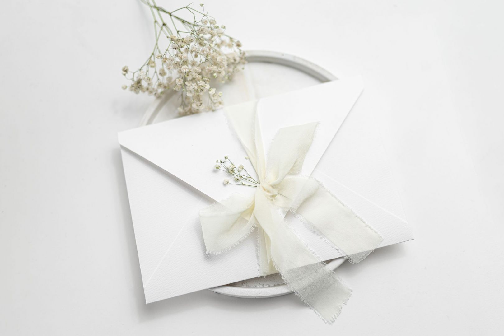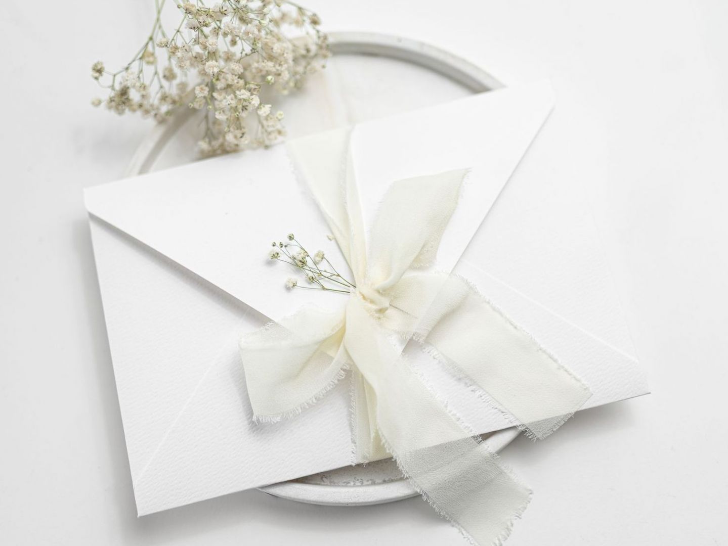Niezwykle elegancka biała koperta przewiązana szyfonową wstążką z dołączonym bukiecikiem z gipsówki.