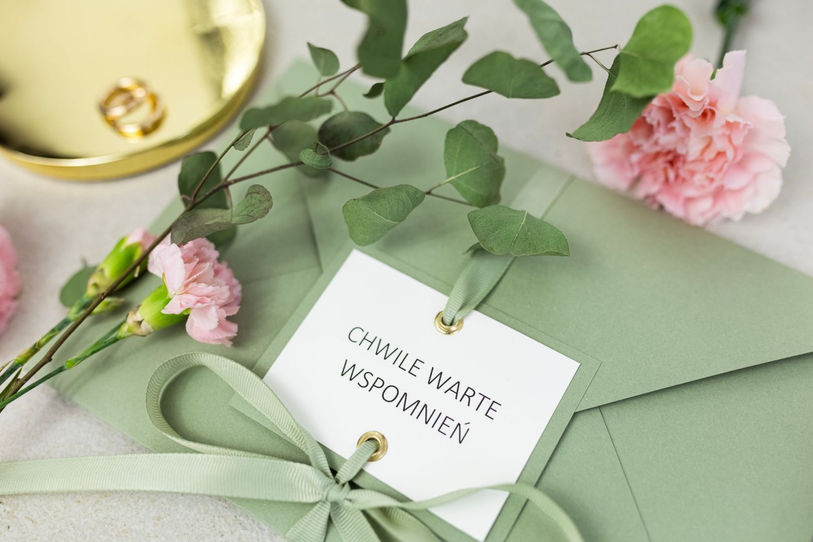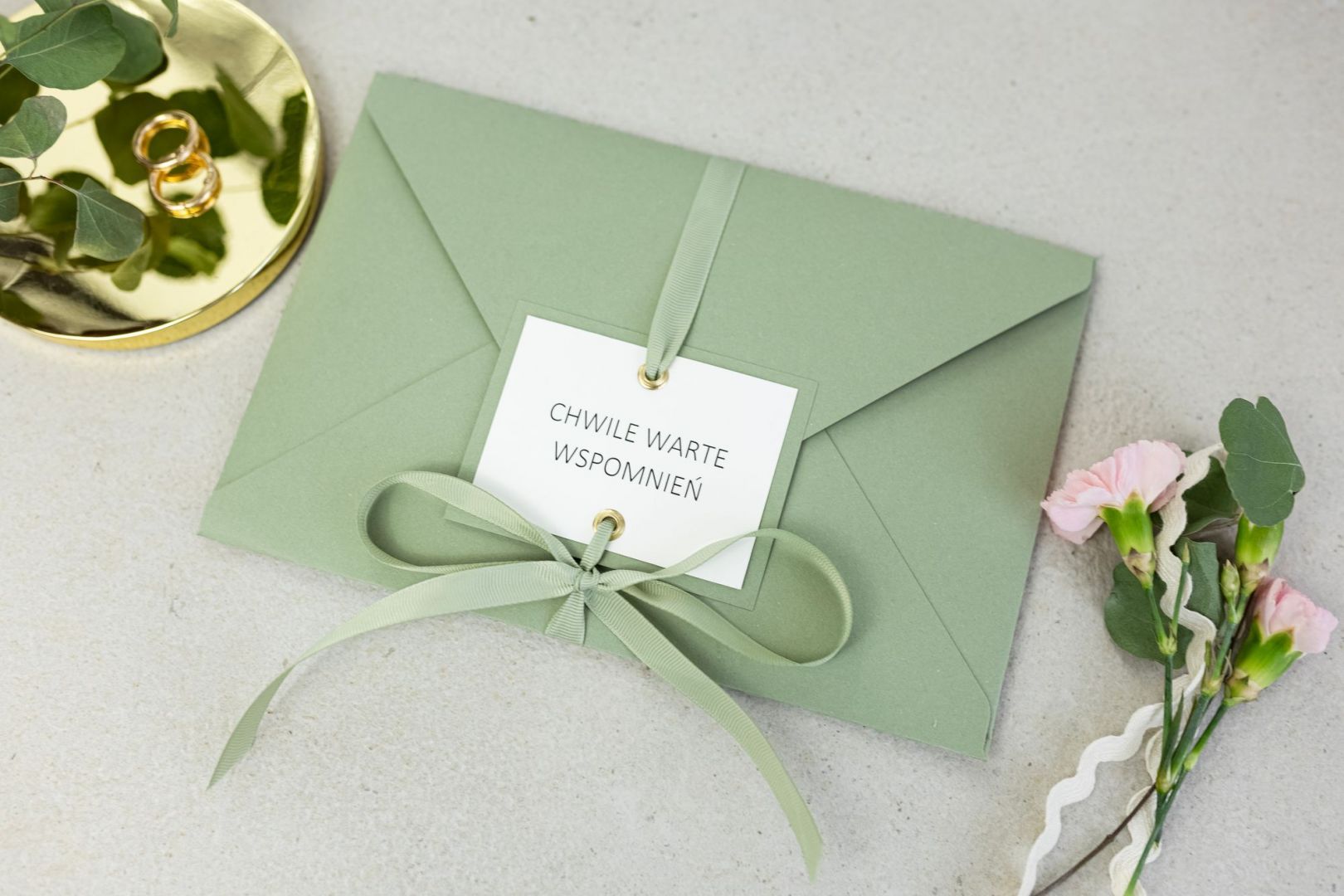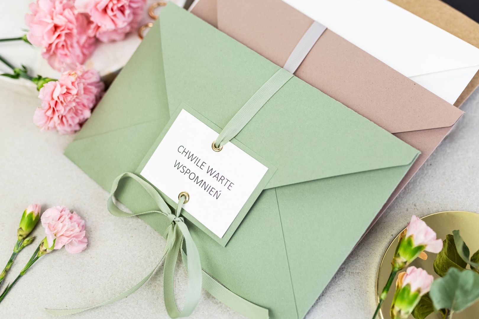 Wyróżniają ją ozdobne złote nity oraz dopasowana kolorystycznie wstążka, która miękko oplata kopertę i nadaje jej lekkości.