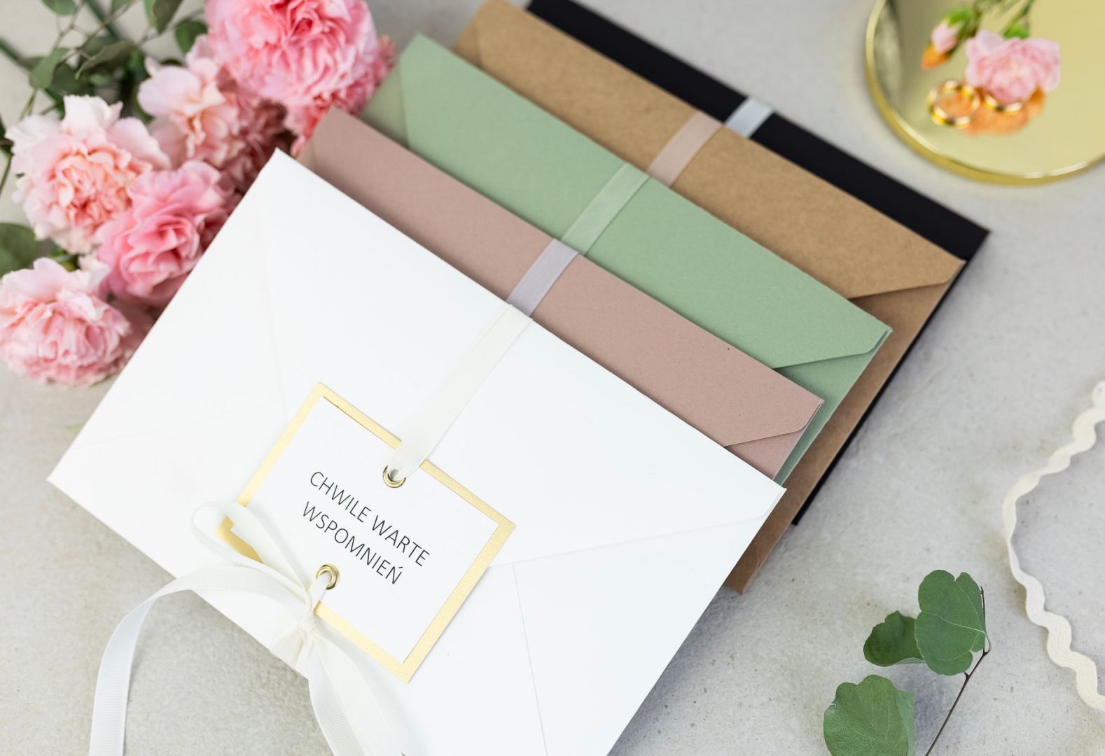 Starannie wykonana koperta dla fotografa została wykończona ozdobnymi nitami oraz oryginalną, prążkowaną wstążką, która dodaje całości lekkości i luksusowego wyrazu.