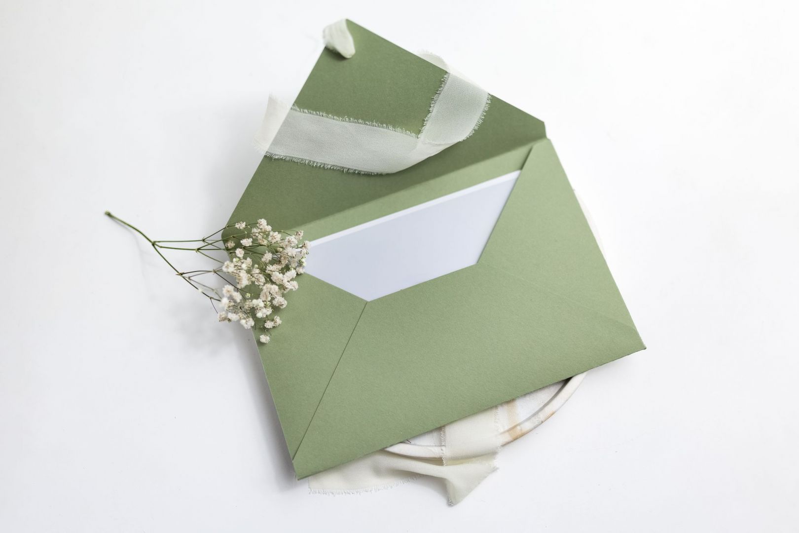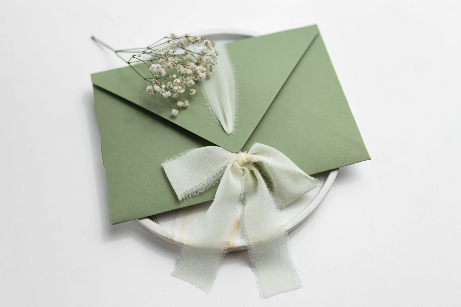 Niezwykle elegancka oliwkowa koperta przewiązana szyfonową wstążką.