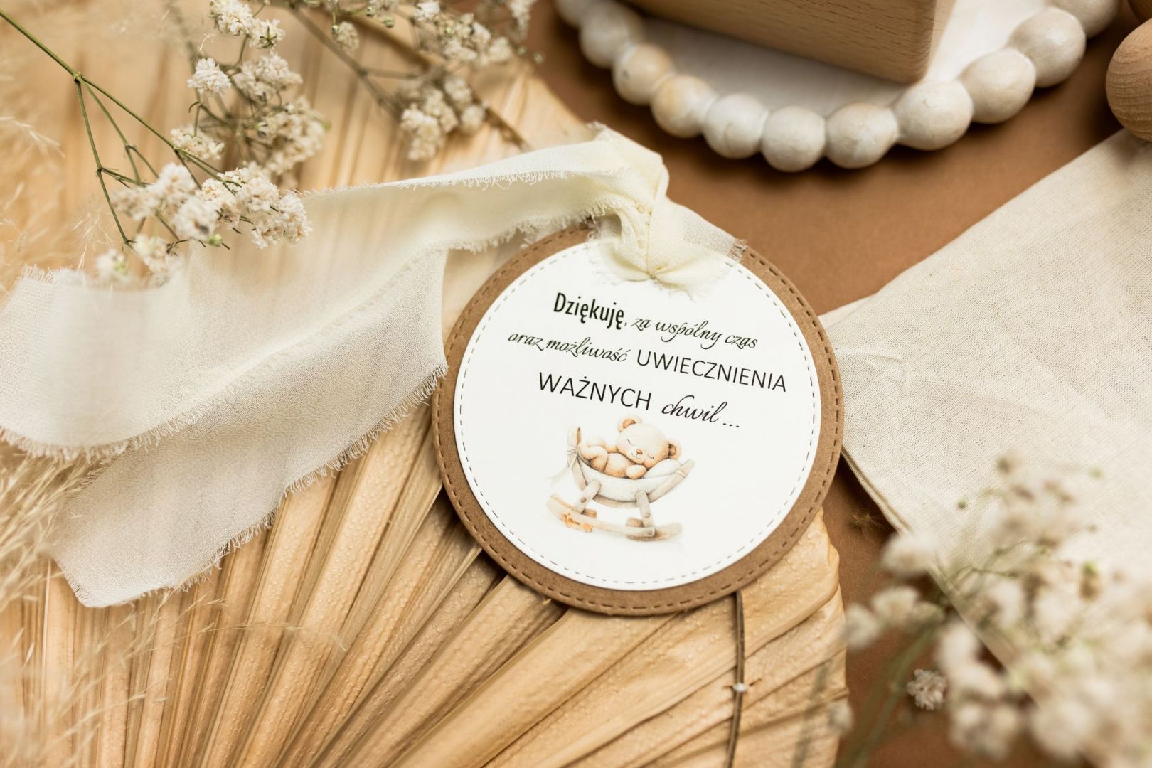 Naturalna, kraftowa forma w połączeniu z delikatną ilustracją śpiącego misia tworzy ciepłą, bajkową całość. Subtelne detale i stonowana kolorystyka idealnie wpisują się w klimat dziecięcych sesji – miękki, spokojny i pełen czułości.