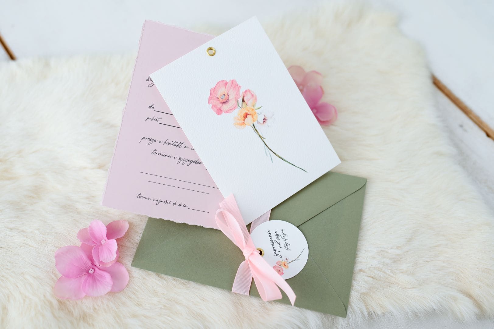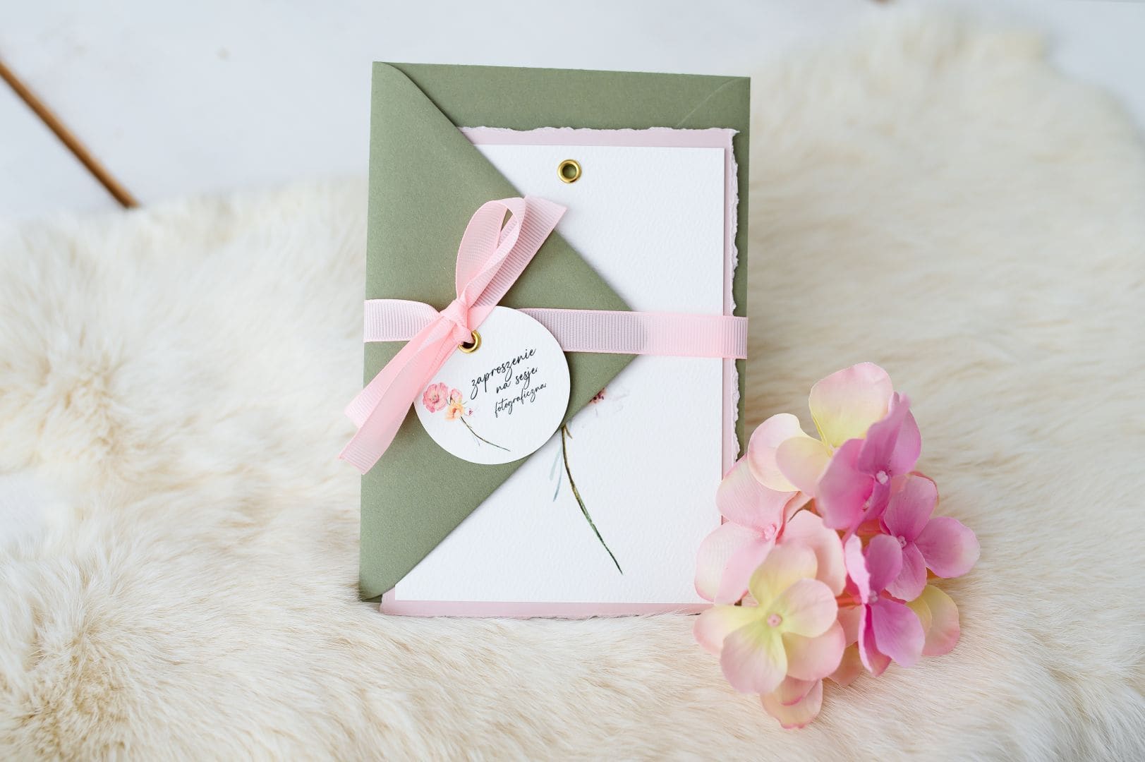 Dwa rodzaje papieru: fakturowany i gładki. Połączone złotym nitem. Całość zamknięta w oliwkowej kopercie przewiązanej pudrową wstążką. Do wstążki dołączona jest etykietka.