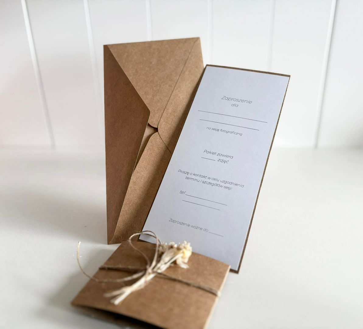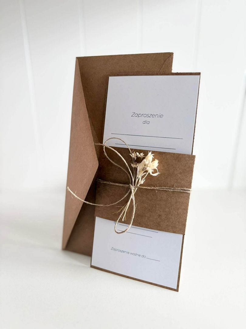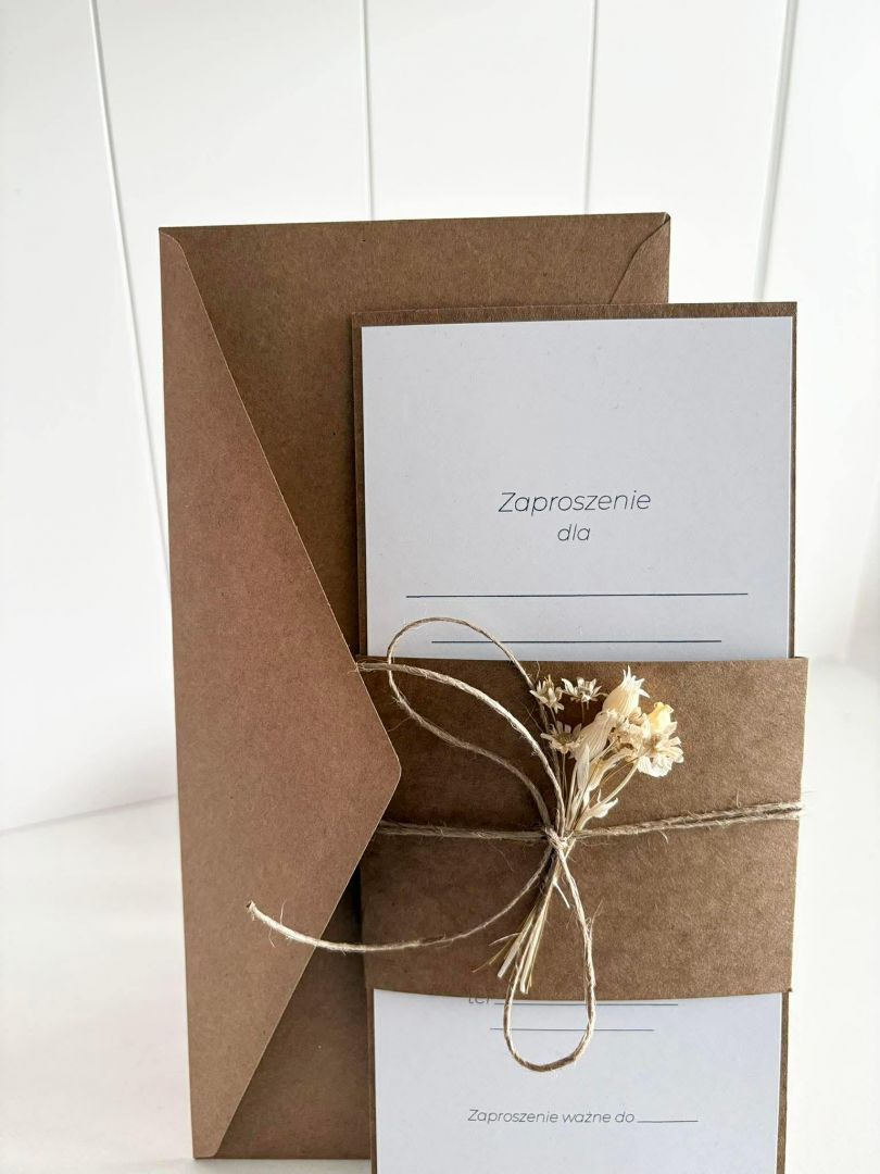 Minimalistyczna forma, kraftowa koperta w formacie DL i delikatny sznurek z suszonymi kwiatami tworzą kompozycję pełną ciepła i subtelności.