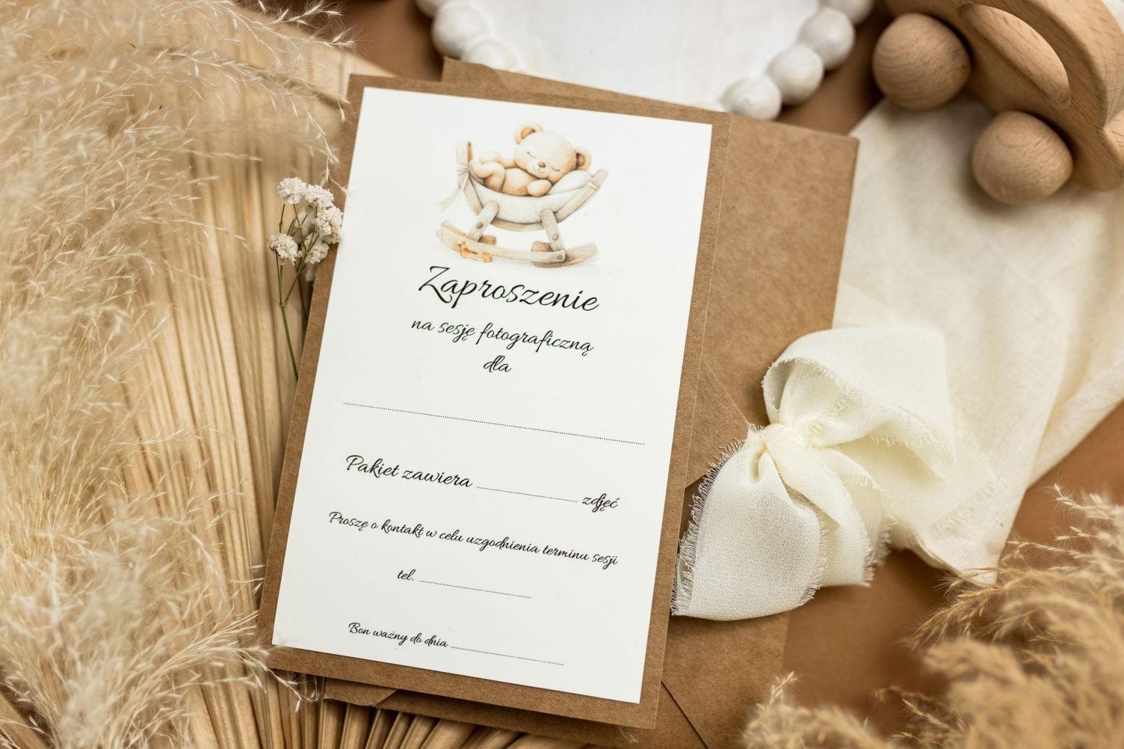 Stanowi spójny zestaw z pudełkiem na zdjęcia, kopertą, podziękowaniem oraz etykietą prezentową, tworząc kompletną i dopracowaną oprawę sesji – od pierwszego kontaktu aż po gotowe wspomnienia.