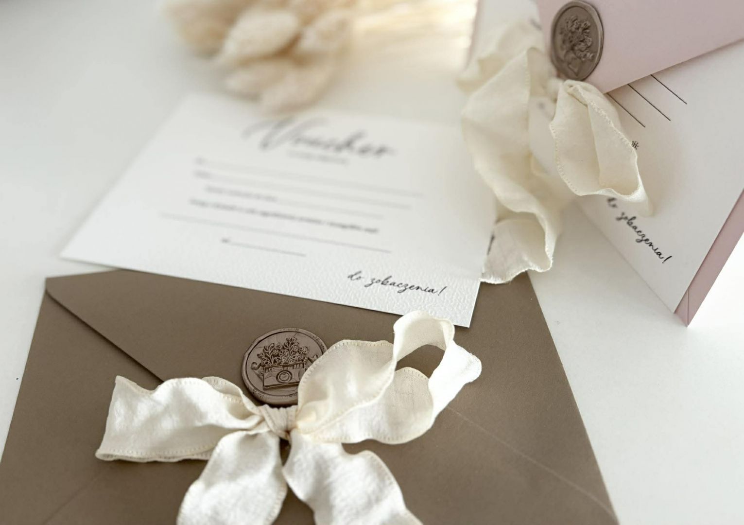 Lak z aparatem stanowi elegancki akcent, podkreślający luksusowy charakter zaproszenia, a delikatna wstążka z naturalnego materiału dopełnia całość, nadając zaproszeniu miękkości i romantyzmu.